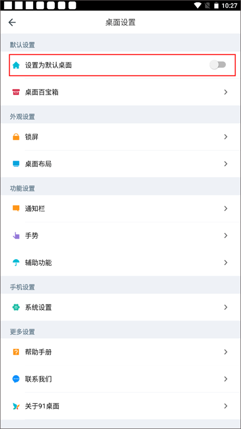2、在默认设置板块中开启“设置为默认桌面”按钮,在弹出框中选中91桌面,再点击“始终”,即可将91桌面设置为默认桌面。
