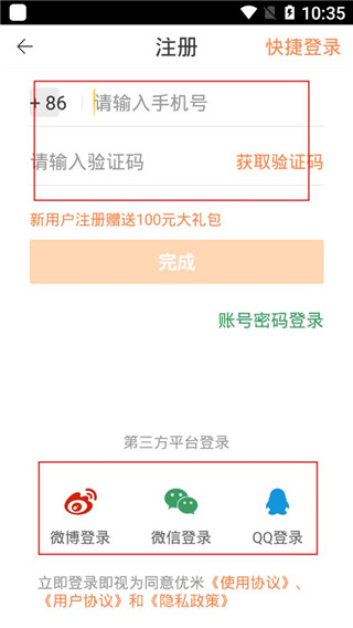 进入到登录页面可以选择手机号、微信、qq、微博登录方式;