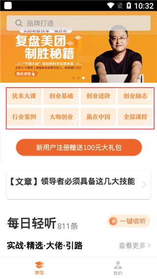 我们在软件主页可以看到:优米大课、创业基础、创业进阶、创业励志等;