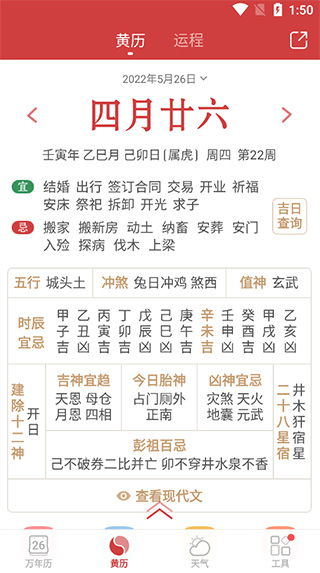 3、黄历可以查看当天的宜和忌,还可以选日子查看运程;