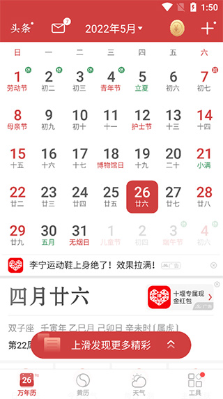 2、万年历中,用户能够查看阳历和农历。点击左上角的头条部分可查看热门资讯,点击右上角的加号则能新建提醒和写日记。