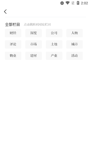 2、其中包括:财经、深度、公司、人物、评论、市场、土地、城市、物业、建材、产业、活动等十二个类别,用户可根据需求自动跳转到相应的栏目。