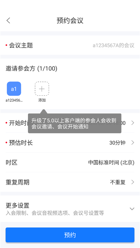 2、选择参会方,选择开始时间和预估时间;