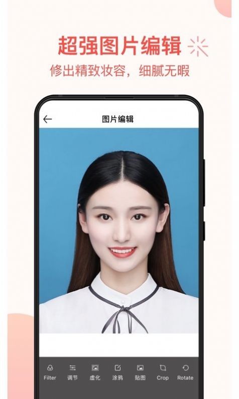 1、自动识别人像,对人脸包含美肤,美白,大眼,嘴唇,美瞳等项的自然美化处理,保证用户拍出好看又实用的证件照。