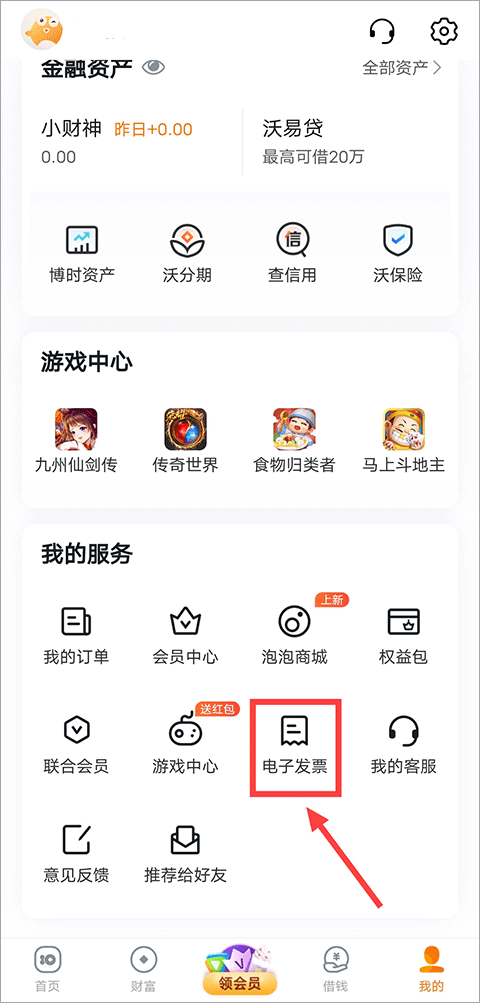 1、打开沃支付app后,在我的界面,将页面滑动到最下方,可以看到有一个“我的服务”,点击其中的“电子发票”