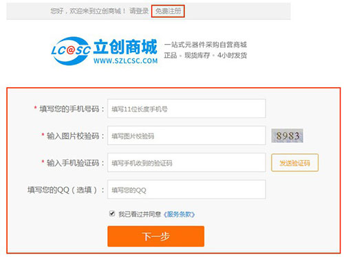 创商城现有库存品种超200000种, 库存种类不断充实中,为您解决元器件样品、小批量采购难题!1、点击页面顶部“免费注册“,进入注册页面。