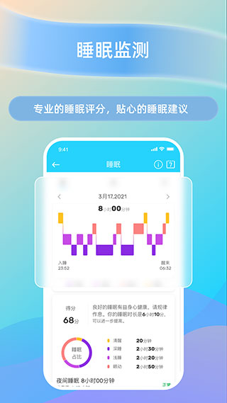 3、图文展示每天的睡眠情况,给予睡眠评分与贴心建议,并统计每周、每月的睡眠趋势。