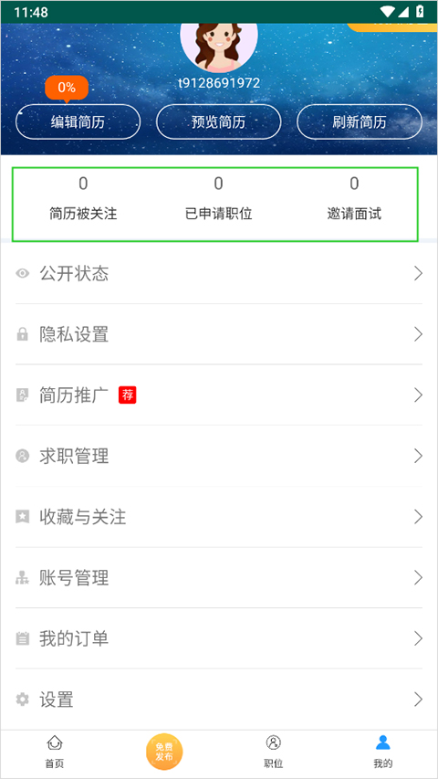 3、若想查看简历关注动态、已投放简历的职位信息以及邀请面试信息,可通过【我的】页面顶部的导航区(即下图绿色方框区域),点击进行切换查看。