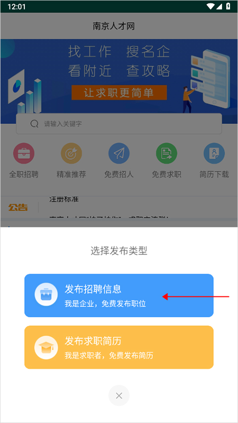 3、在此,以点击底部导航区里的【免费发布】为例。当点击【免费发布】后,页面底部会弹出选项框,需在该选项框中选择第一个发布类型(即下图红色箭头所指区域)