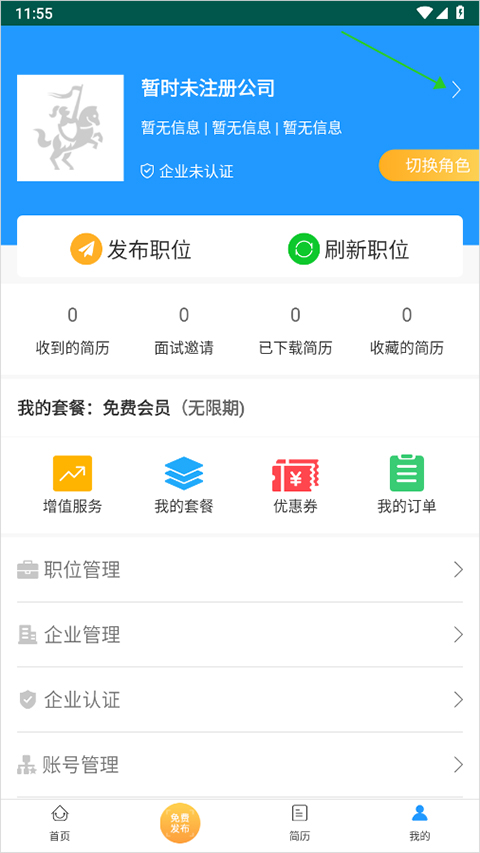 1. 打开并登录南京人才网app,进入【我的】页面,点击页面顶部右侧的“>”图标(即下图绿色箭头所指处),在弹出的新页面中开展免费企业认证。
