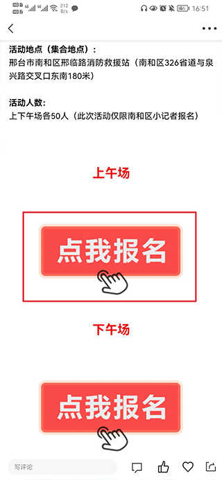 三、进入后往下滑,选择上午场或下午场后,点击点我报名