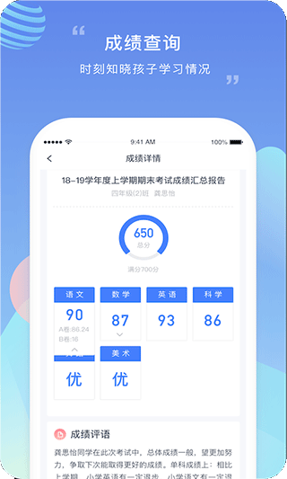 3、成绩报告:家长可查询已公布出的每次总分及各科成绩。