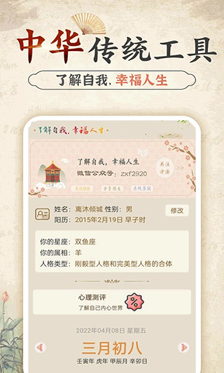 3、【心理测试】爱情测试、性格测试、抑郁测试、情商测试等各类专业测试,帮您探索未知的自己;【个人查询】:分析五行平衡,属相,人格类型。