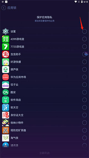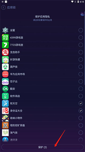 点击需要保护的应用后点击保护;