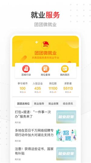 “团团微就业——共青团服务青年就业平台”,由团中央支持,将以各项“共青团认证”,帮助大学毕业生提高就业竞争力。“青年大学习”是共青团最具知名度的政治理论学习平台。客户端还为青年提供婚恋、考试、义诊等方面的网上服务。