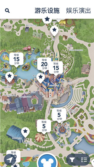 查看等待时间及演出安排:快速查看景点及娱乐演出预计等待时间以及当前正在发放的快速通行证的返回景点时间,查看花车巡游及娱乐演出时间