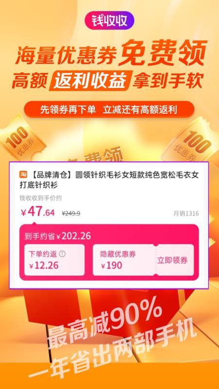钱收收是一款助力用户实现返利购物的应用程序。用户可以通过该应用在平台上查找所需商品,获取优惠券以享受折扣价购物,相比直接购买可节省30%到80%不等的费用。此外,在下单后还能获得额外的返利奖励。这种既能节省开支又能赚取返利的购物方式,提供了极佳的用户体验。除了在线购物,该应用还支持订餐服务,提供大量无门槛的外卖优惠券及每日特惠券,满足一定消费额度还可以减免部分金额,真正实现了经济实惠的外卖点餐体验。无论你是选择美团还是饿了么,都能让你用更低的价格享受到美食。此外,使用钱收收进行手机充值同样能节省开销,每月至少可以节省50元。有需要的用户快来下载钱收收应用程序吧!