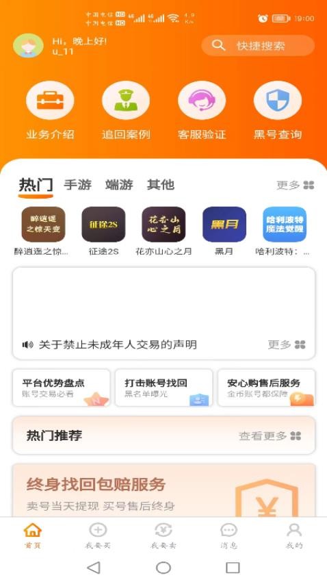 蓝盾游戏交易平台主要为用户提供游戏产品的交易服务,包含多种类型的游戏账号供您查阅和购买,包括手游、端游、网页游戏等。根据您的需求,您可以在线购买账号或出售个人账号,并且可以在购买过程中与账号持有人在线交流,获取账号详细信息,进而进行价格谈判。此外,该平台还会实时更新您的个人订单,让您清晰了解订单详情;蓝盾游戏交易平台还提供多种特色服务,如终身找回赔偿、快速账号回收、安心购保障等,全方位确保账号交易安全,使您能够放心买卖账号。需要的用户请尽快下载体验。