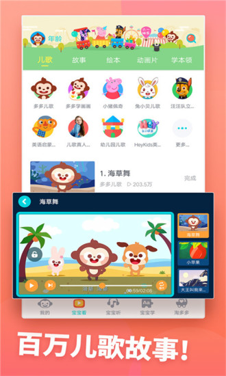 百万儿歌故事、动画绘本、互动场景、睡前故事、音律童谣、亲子舞蹈……更多优选内容给孩子一个快乐的童年。