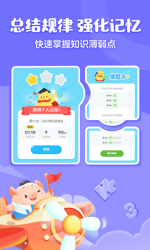 2、科学闭环:冒险闯关、趣味竞赛与算力错题本等功能相结合,用科学方法引导孩子加强学习效果、培养自主学习好习惯