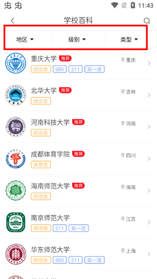 2、进入软件的列表可以按照不同的地区、级别、类型进行选择不同的学校。