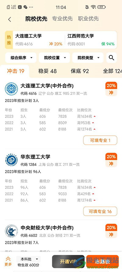 3、在这里软件会将合适的大学列举出来,分为冲击、稳妥、保底三大类。