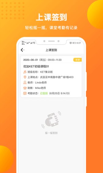 打开优加青少英语app,轻轻摇一摇,轻松搞定上课打卡。