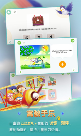 3、通过绘本、视频、动画、游戏等教学形式,趣味闯关、任务挑战、录音配音、语音测评等互动手段,让学习更高效,让陪伴更轻松,让成长更快乐。