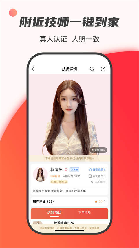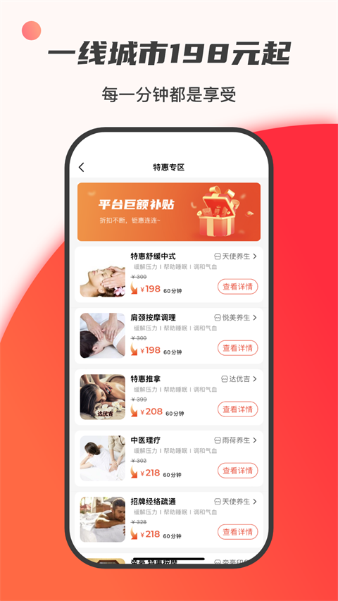 提供推拿、油压SPA、足疗保健等多种上门按摩服务,汇聚中医、推拿、SPA等品类,为用户带来高价值、高标准的养生健康体验。24小时上门服务,专业、正规、安全、便捷,确保健康到位。