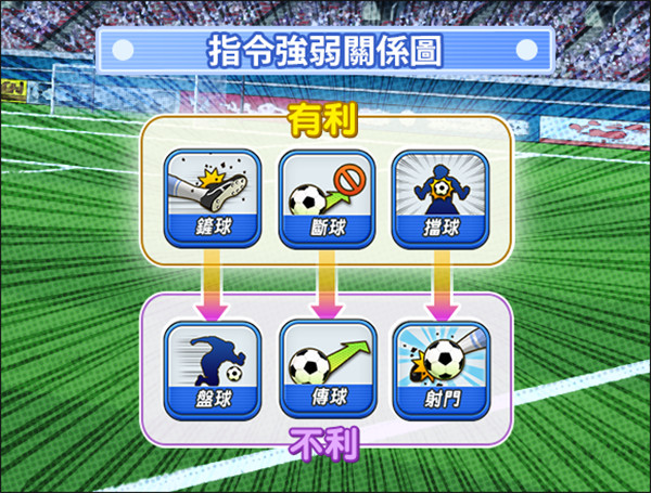 3、球员总共有力、速、技3种属性,三种属性之间有著像猜拳一般相生相剋的关系,对战时别忘了注意对方球员的属性。