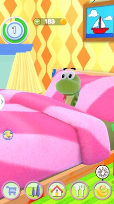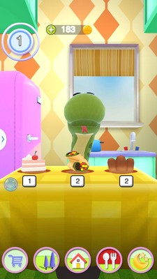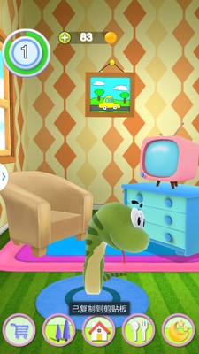 1,整个界面是卡通风格,场景的颜色搭配让人感觉很温暖和可爱,不可怕,你可以喂蛇,浴,盖被子,还让它跳舞和学习说话呢。