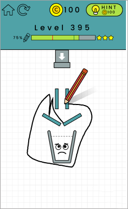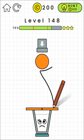 第148关,此关卡要求我们通过画线来构建一个翘杆,借助球的力量把水杯上的木板撬离。玩家可参照上图进行画线操作,从玻璃杯右侧隔板的右端朝着左上方画线,在顶端弯曲成勺子形状以接住可移动的大球。如此一来,游戏开始后,大球会落下撞击线段,进而将右侧隔板砸落。由于线段的阻拦,大球会向左边滚落,把左侧隔板也砸掉。至此,便没有任何物体妨碍水杯接水了。