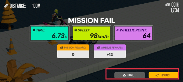 6、比赛结束后,会展示你赛车的用时、速度等信息。此时,你既可以点击“HOME”返回主页,也能够点击“RESTART”重新进行比赛。