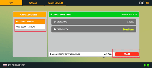 2、可选择的路段有两种,分别为100米和200米。选定后,点击“START”开启游戏。