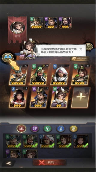 在战斗前,主公需要布置一下上阵的武将,最多选择上阵8个武将,可以选择重复的武将上阵。主公可以自由搭配武将,但是要注意武将之间的配合联动,合理搭配单体型、群攻型、控制型武将能让战斗事半功倍哦!待主公熟练后可以选择“一键布阵”的功能。