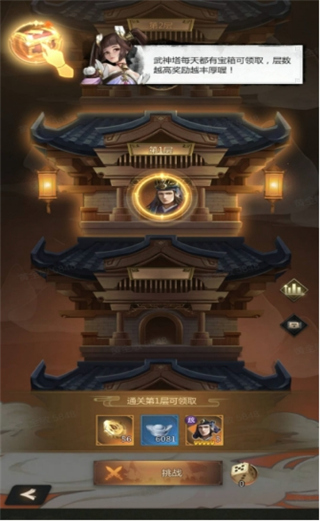 玩家每天挑战武神塔的次数没有限制,只要挑战成功即可获得奖励,且每日可获得武神塔宝箱奖励,随着爬塔层数增加,奖励便越丰厚。