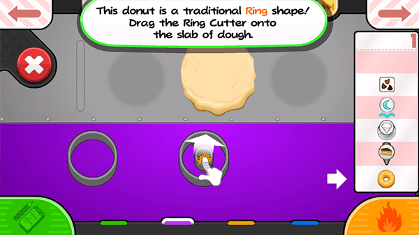 2、首个操作间为生面团站,制作甜甜圈所需的生面团有着特殊形状。玩家要挑选一块面团,放置到工作区域。接着,用擀面杖把面团擀平,摊成圆形面饼,随后借助模具完成造型。