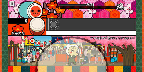 红色:敲打鼓面。分数随着连段数和精确度评定。“良”的分数是“可”的分数的两倍。· 蓝色:敲打鼓边。