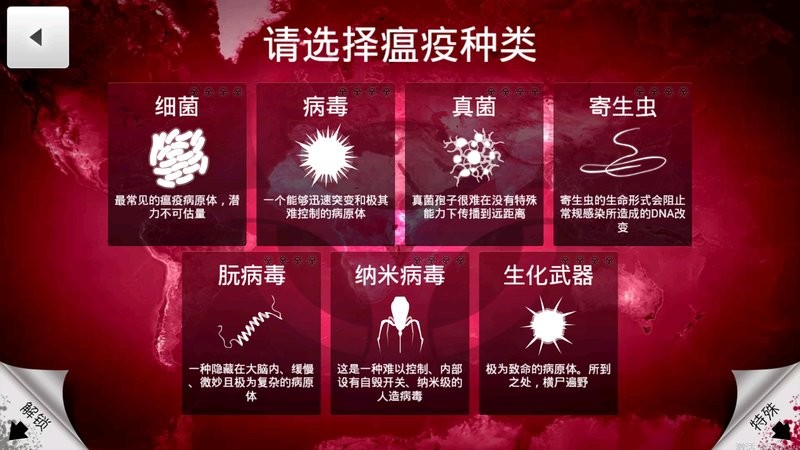plague汉化版全瘟疫解锁安卓版,一款以病毒传播为核心的高自由度策略模拟手机游戏。玩家将扮演“瘟疫制造者”,通过解锁细菌、病毒、真菌等7类基础病原体及Neurax蠕虫、Necroa僵尸病毒等特殊类型,制定传播策略并应对全球政府的医学反击,最终达成全人类感染的终极目标,玩家无需付费即可体验prion(朊病毒)、ano-virus(纳米病毒)等高级瘟疫的进化路径,持单人剧情及多人对抗,模式难度任选,喜欢这类探索病毒传播游戏的用户赶快来看看吧。