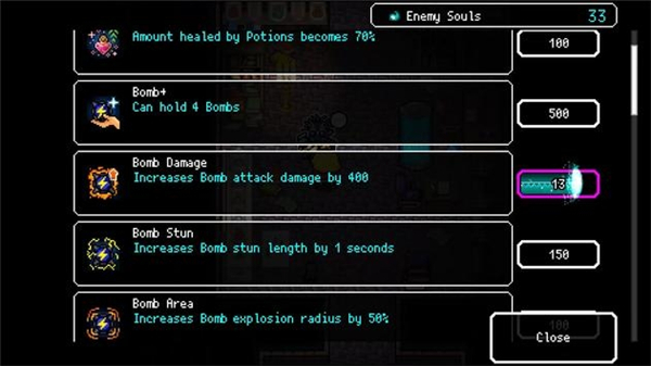打败BOSS后可以进入下一层,在战斗中获得的金币可以在地图中随机生成的商店购买道具和武器,蓝魂可以在道中的NPC处解锁人物动作和道具槽等附加功能。