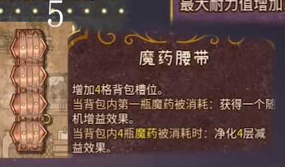魔药腰带:增加4格背包槽位,当背包内第一瓶魔药被消耗时获得一个随机增益效果,当背包内4瓶魔药被消耗时净化4层减益效果。