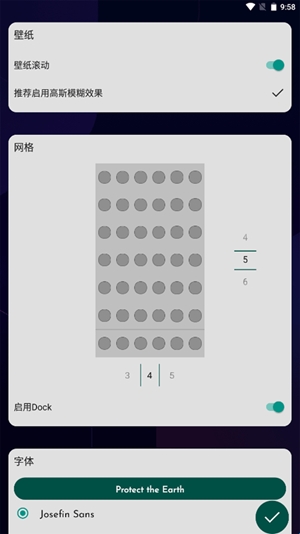 打开app,设置壁纸滚动、高斯模糊效果,网格形式以及字体等,点击右下角的“√”;