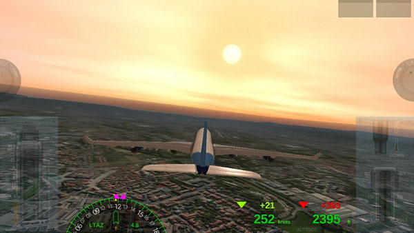 接下来是着陆模式,这是这个游戏的重点,我们需要先降低自己飞机飞行的高度,然后寻找到我们需要降落的跑到,接下来就是在空中调整自己飞机的姿态,使得自己的飞行角度和跑道的角度是一样的,然后慢慢的减速降落,落到跑道上时放下轮子进行慢慢减速直到停止。