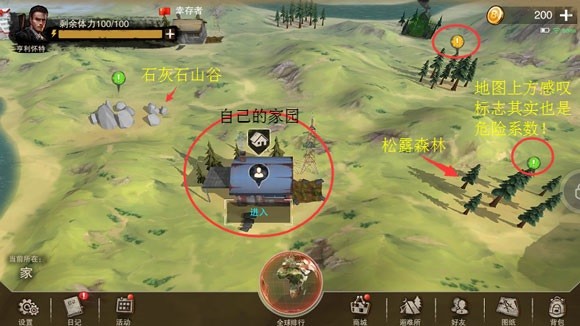 消耗体力(体力消耗其实就是离开家园去往其他物资地图所消耗的体力,你可以选择消耗一定体力快速到达,也可以选择步行,消耗时间到达,选择步行消耗时间可以离线来消耗,不需要一直挂着等)