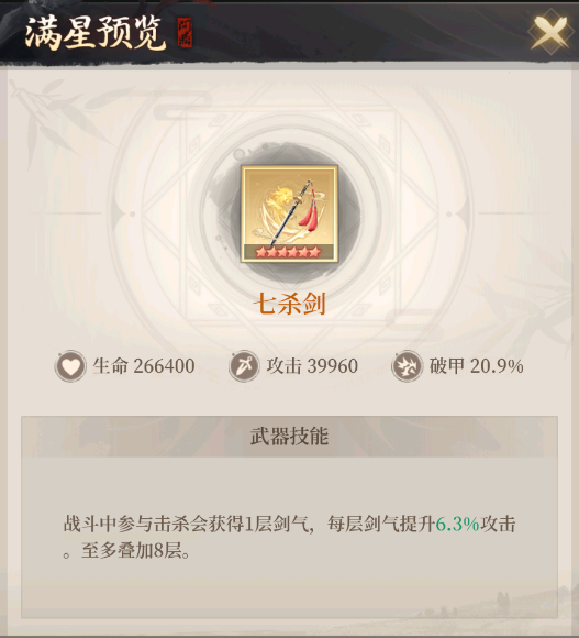 注意!这套阵容在前期有点弱势。因为6气宗羁绊的效果是提升技能伤害(气宗侠客每释放1次必杀技,能叠加1层buff,提升30%的攻击力,最多能叠加10层),而技能需要升星才能提升伤害,解锁特殊效果,所以前期侠客没养起来,星级不够高的时候玩起来比较难受,但只要撑过前期,战斗力就会直线飙升。既可以出其不意一招制敌,又能靠叠加buff在持久战里,绝对是物超所值,值得投资。