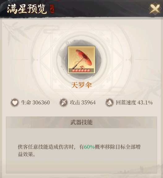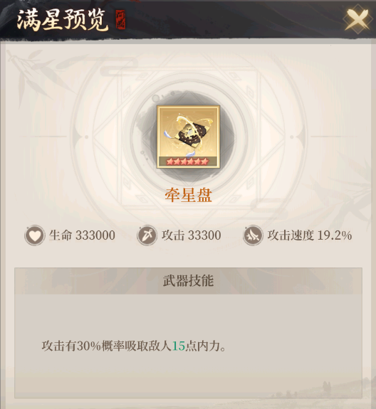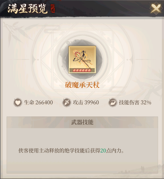 袁天罡:前期养到2星,解锁第1绝学【天罡决】就基本够用了,升到4星就能成型,4星前推荐【玄武壁】,4星后推荐【破魔承天杖】,或者其它能回内力的武器。
