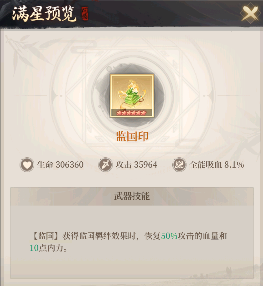 到了后期可以带【监国印】,提高自身坦度,李存礼的爆发很高,很容易触发回血、回内力的特效。