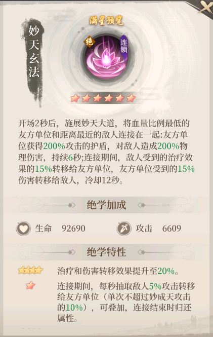 妙成天:能为队友施加高额护盾,升到2星解锁第1绝学【妙法玄天】能提供更多的护盾,以及比较特殊的回血效果(敌方回血,自己也回血)。武器首选【梵音大觉】,可以大幅提升幻音羁绊的效果。