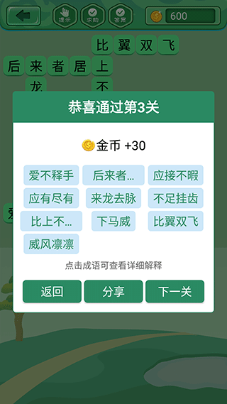 2、由浅入深,由易到难的学习模式,让你轻松体验成语闯关的乐趣。