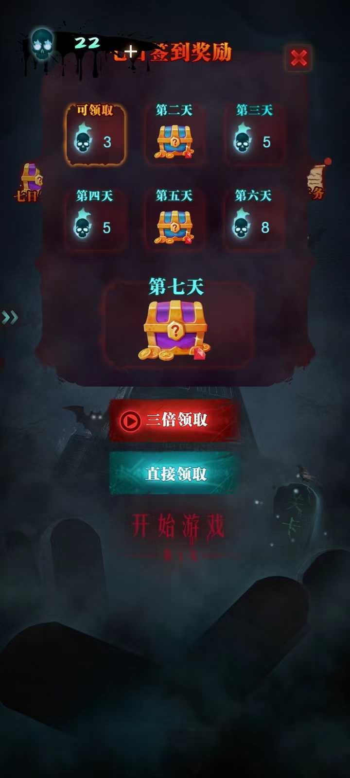 然后我们我回到之前的页面,也就是开始游戏的那个页面,点击上方的【七日签到】以及【任务】可以领取相应的奖励;